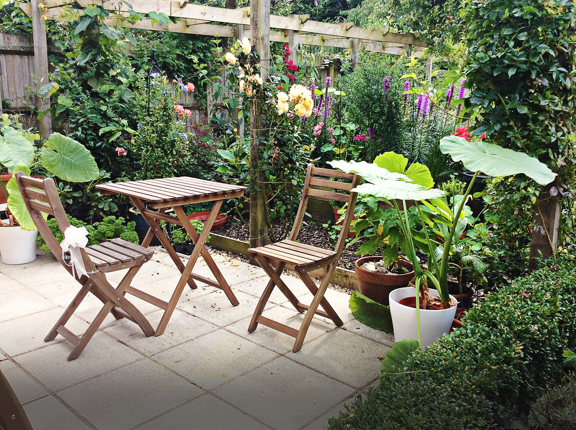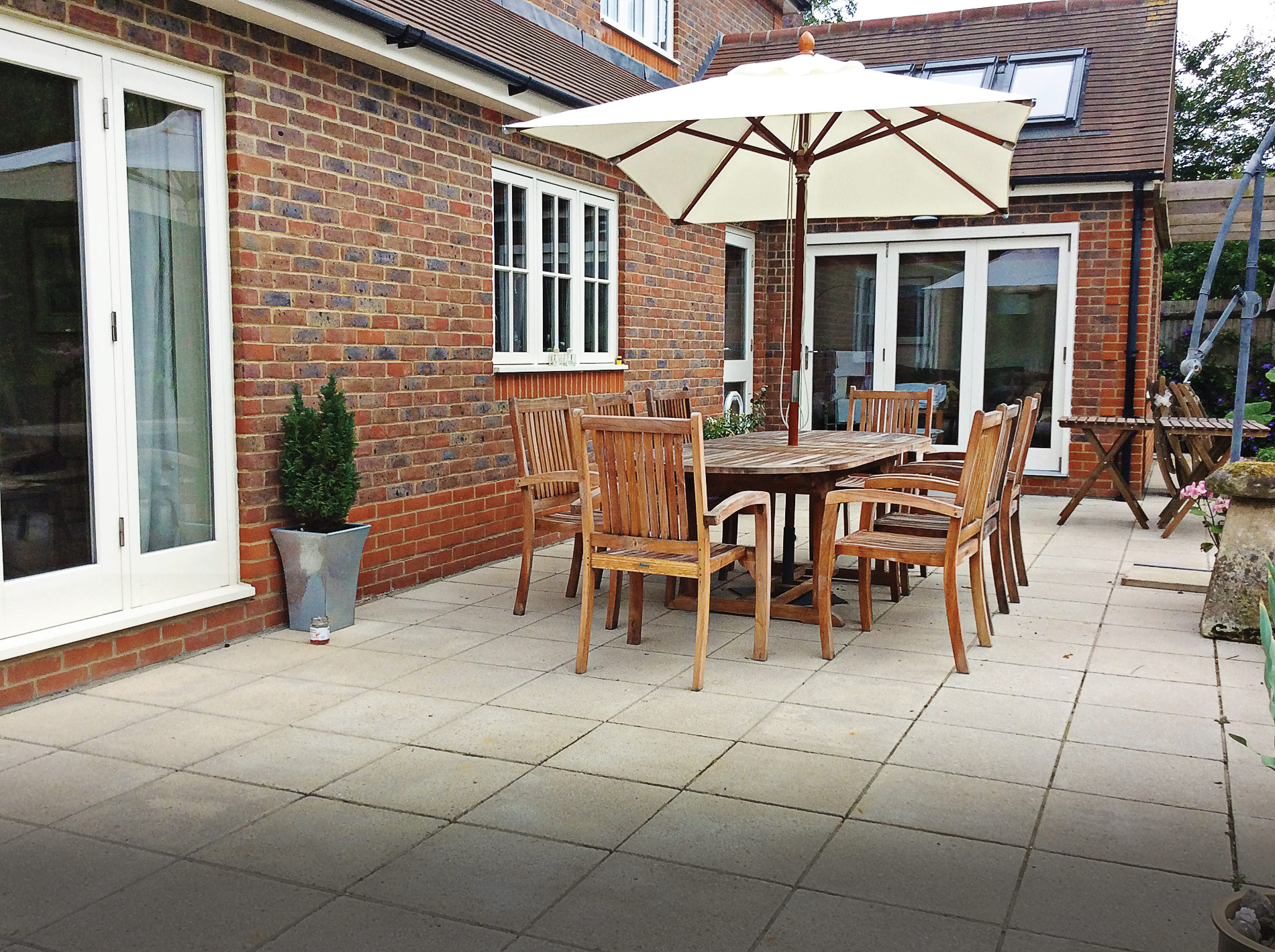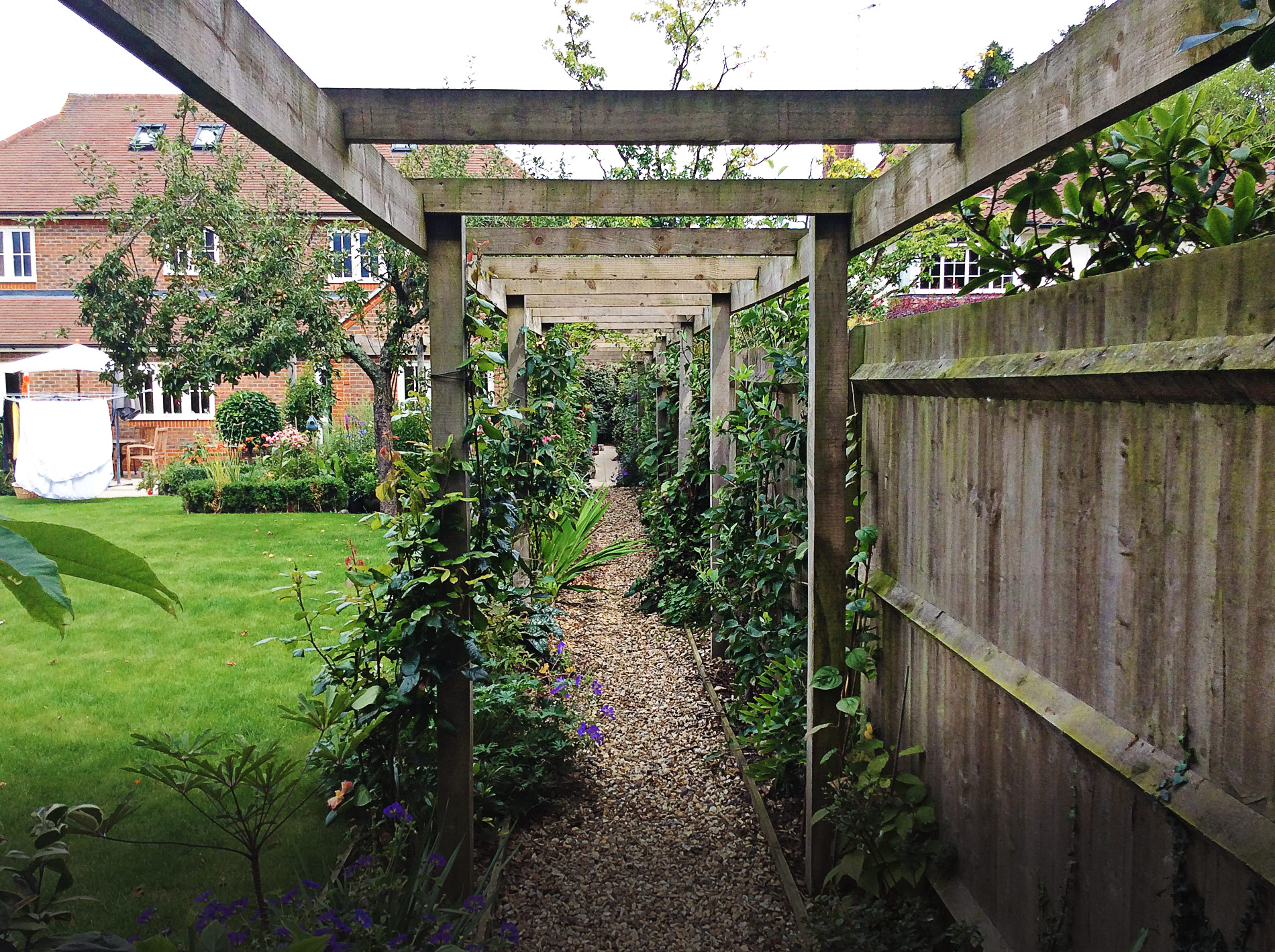 We laid the slabs for this outdoor dining space and built the pergola and pathway that stretches the length of the garden.